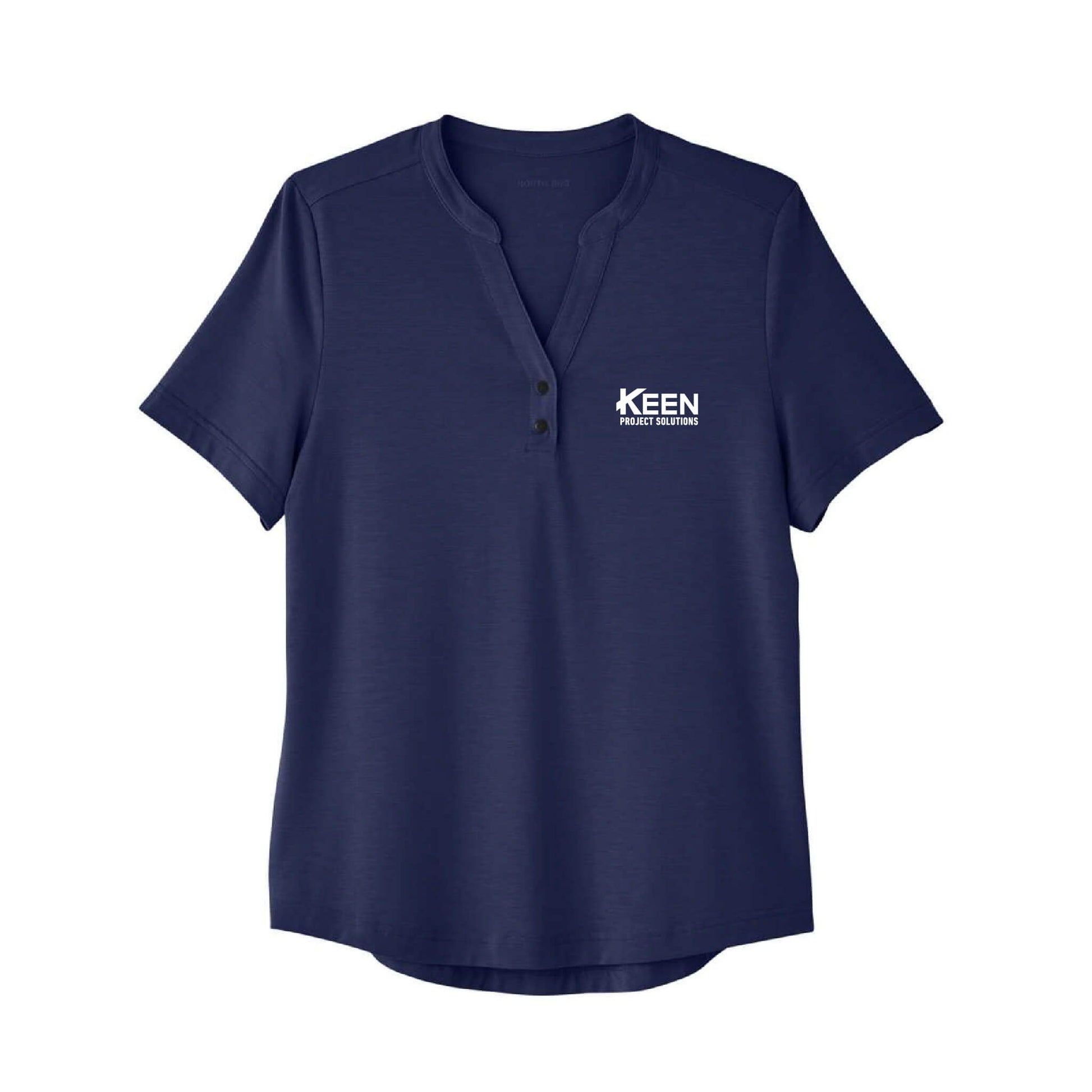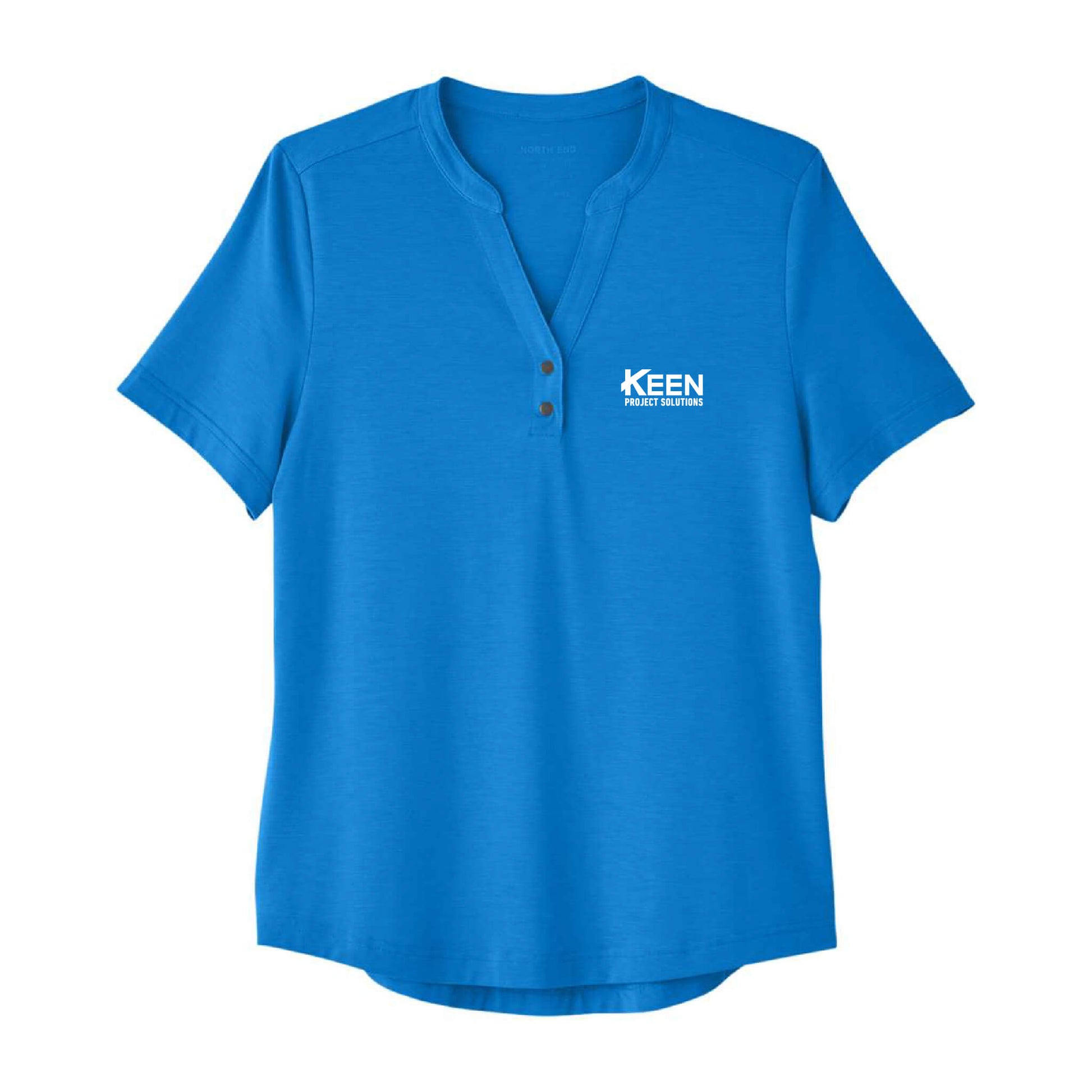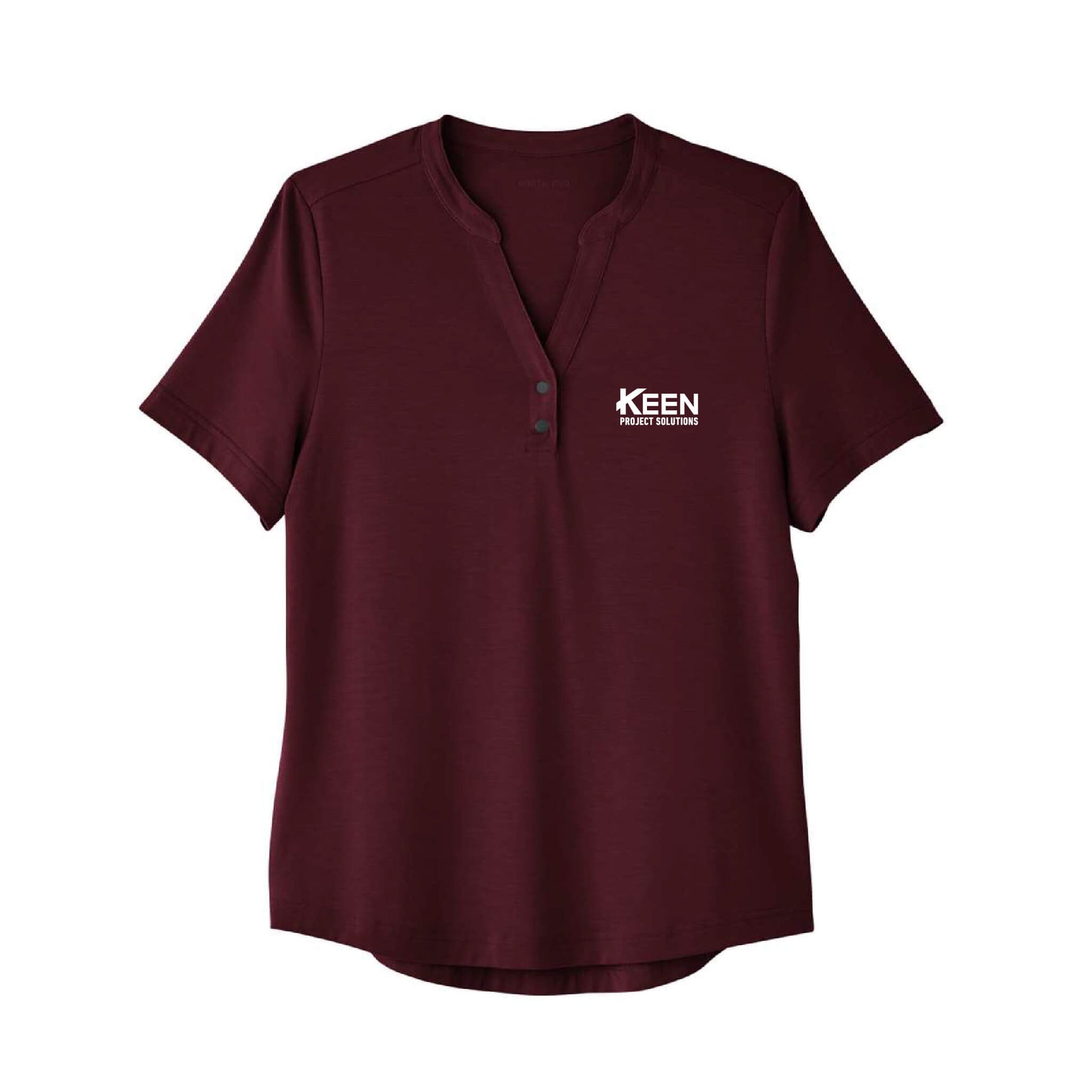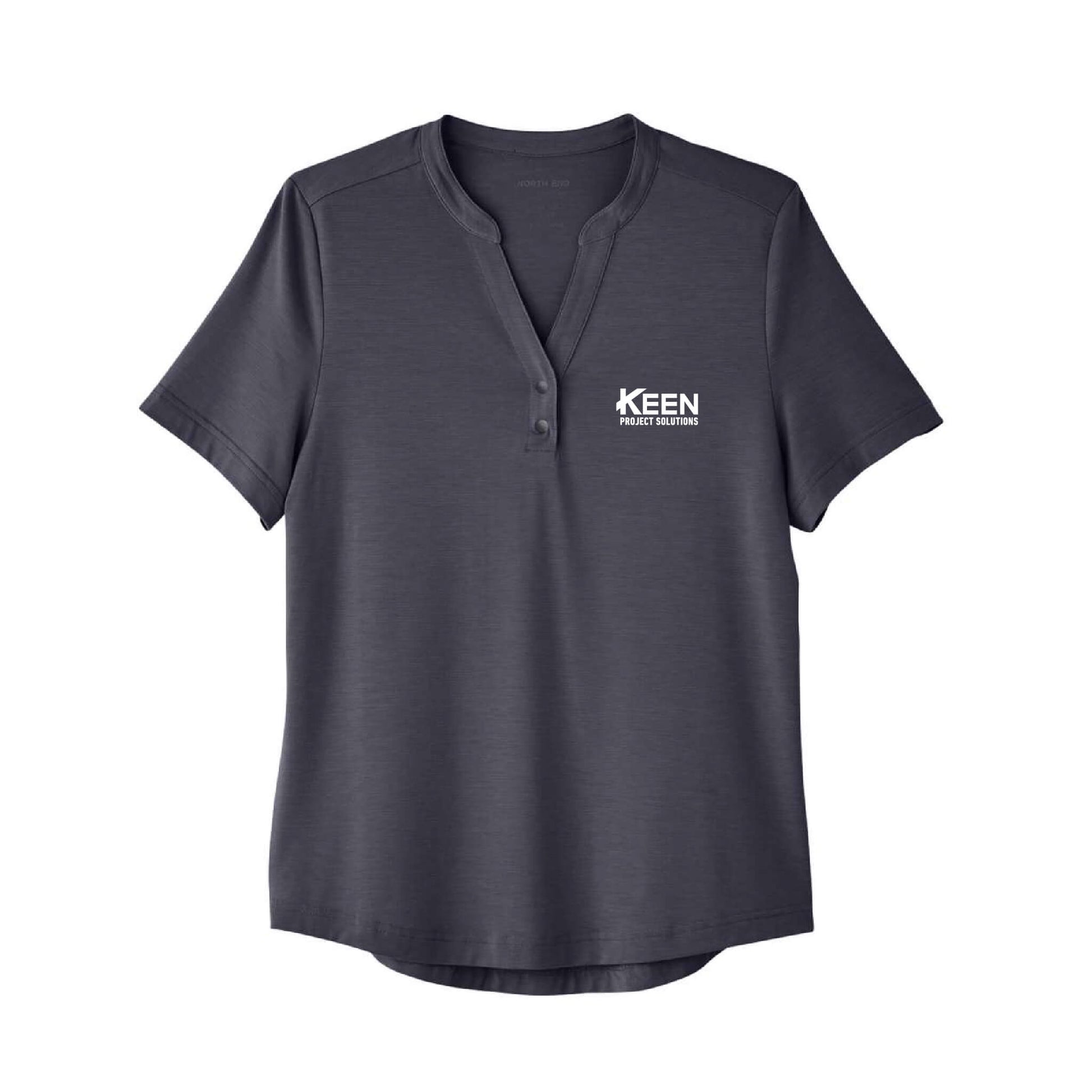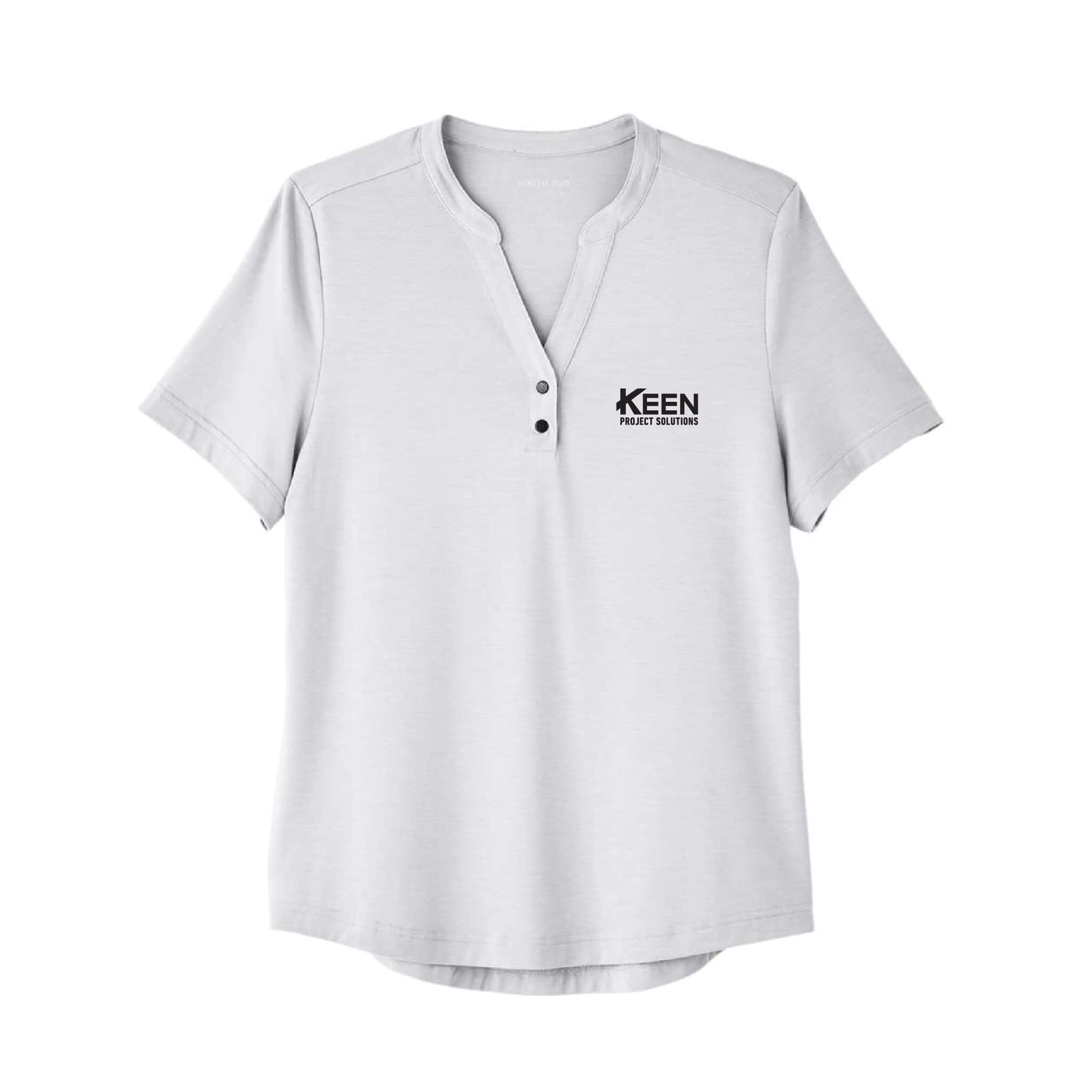 - Henley placket with metal two-snap closure